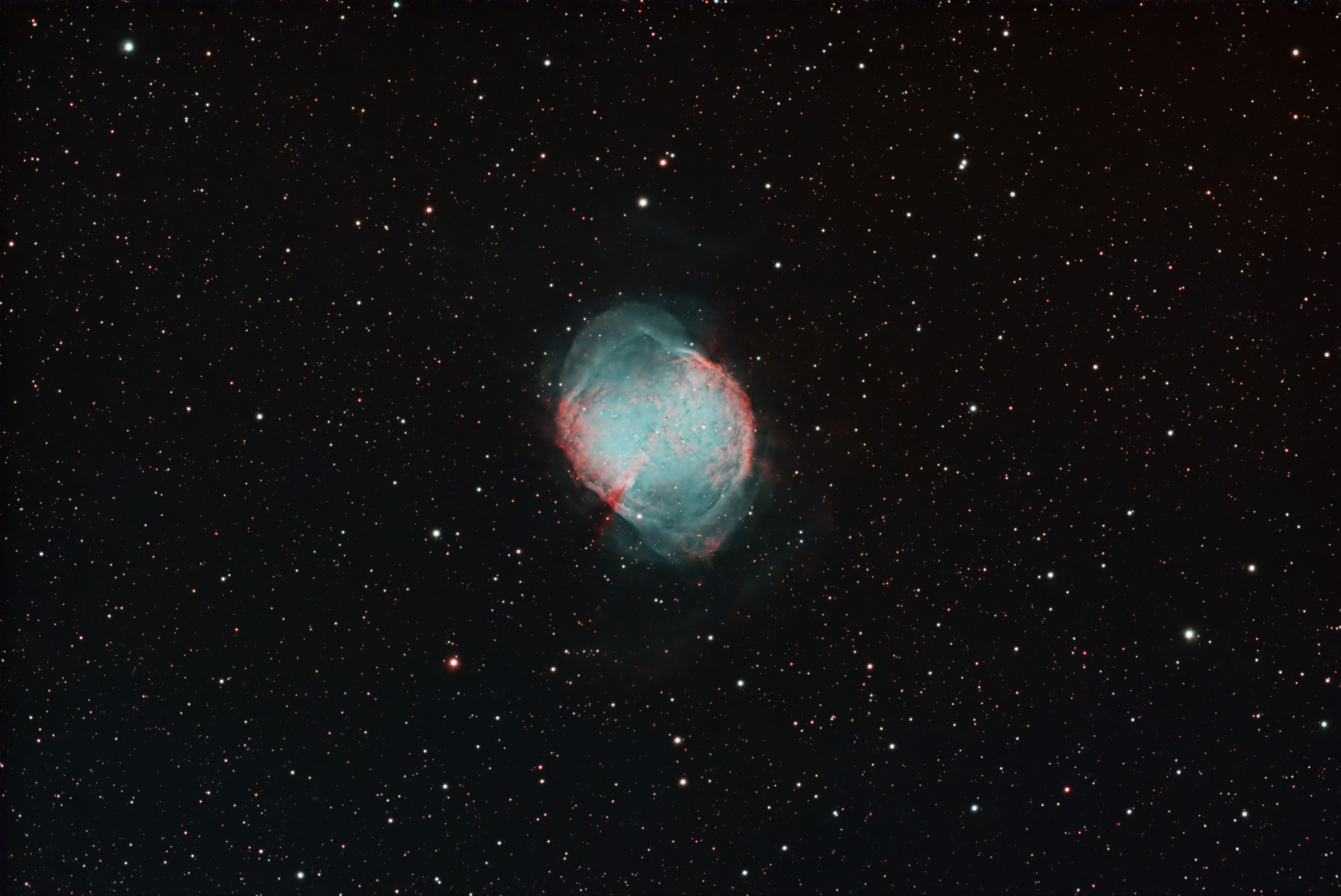 The Dumbbell Nebula (also known as the Apple Core Nebula, Messier 27, and NGC 6853) is a planetary nebula (nebulosity surrounding a white dwarf) in the constellation Vulpecula, at a distance of about 1360 light-years.